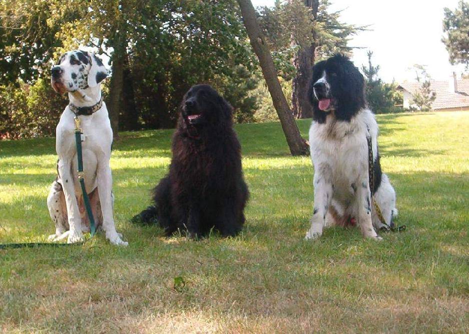 de gauche à droite:Twister dogue allemand de 16 mois , Punch croisé Terre-Neuve de 5 ans et Upsylhon Landseer de 10 mois