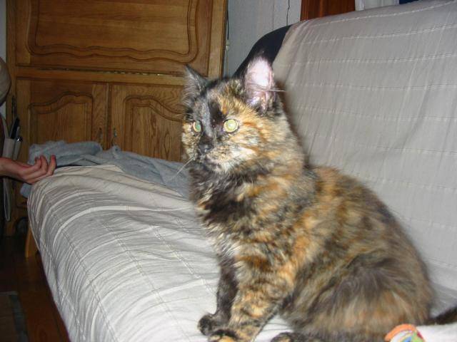 Voilà notre petite chatte , Morphine , elle a queatre mois environs et a un pelage magnifique et de beaux yeux verts ....