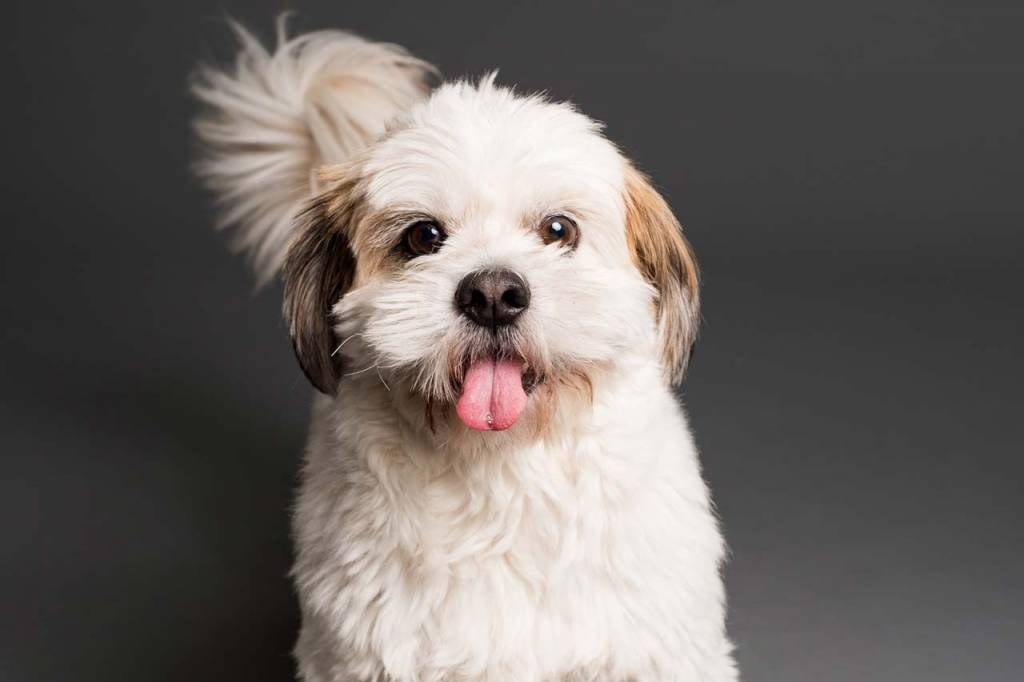 Un Affen Tzu blanc faisant face à la caméra avec un arrière-plan gris foncé