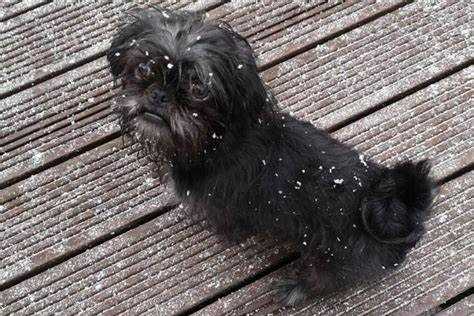 Un Affen Tzu debout à quatre pattes sur une terrasse en bois avec des flocons de neige