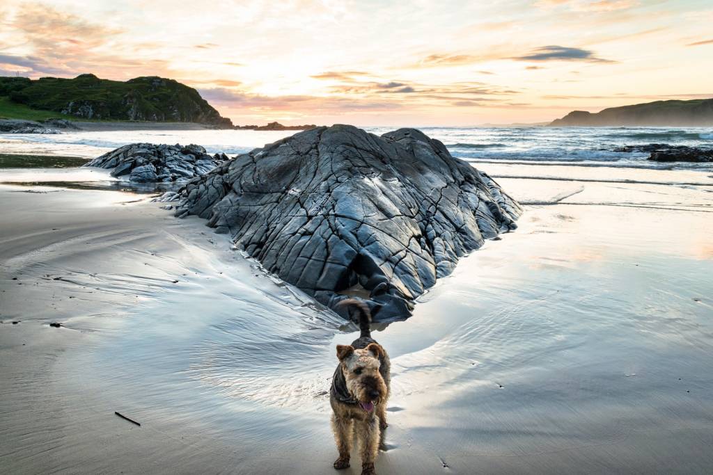Un Airedale Terrier en promenade au bord de la plage