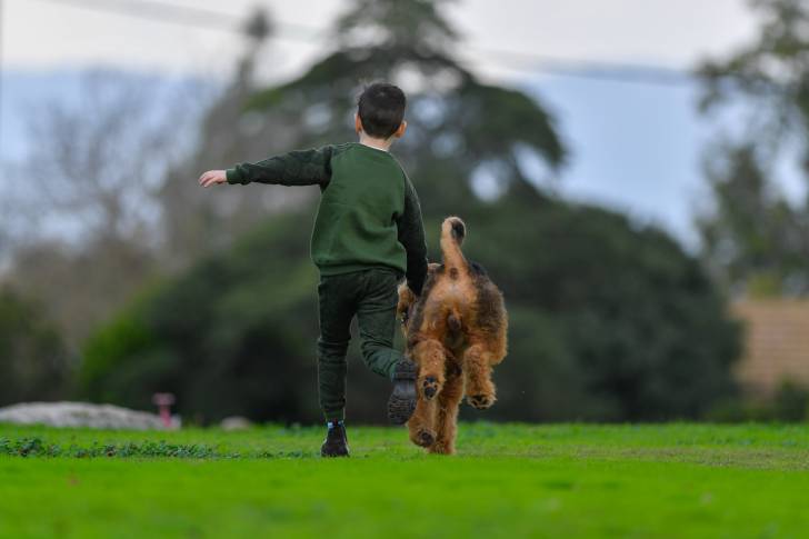 Deux Airedale Terriers qui obéissent au doigt et à l'œil