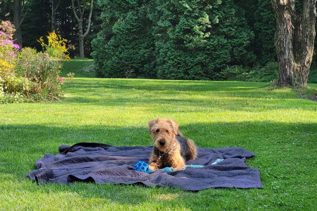 Un Airedale Terrier allongé sur un tapis et qui est tenu en laisse