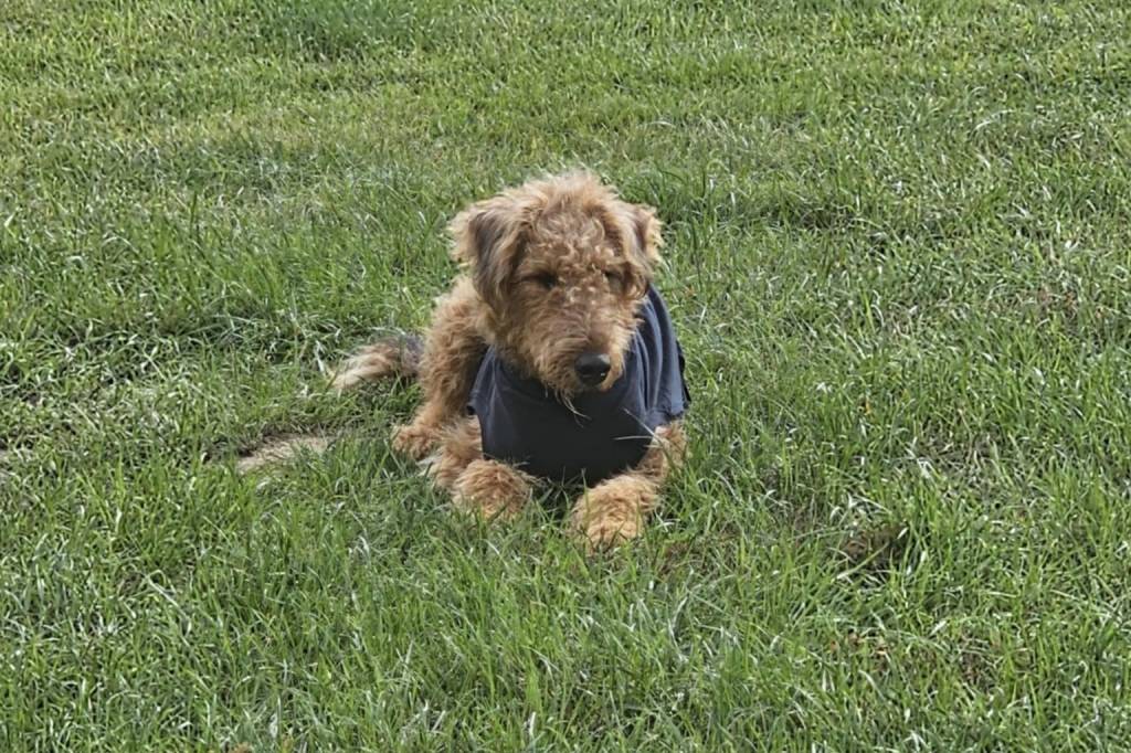 Un Airedale Terrier allongé sur une surface gazonnée et portant un habit pour chien