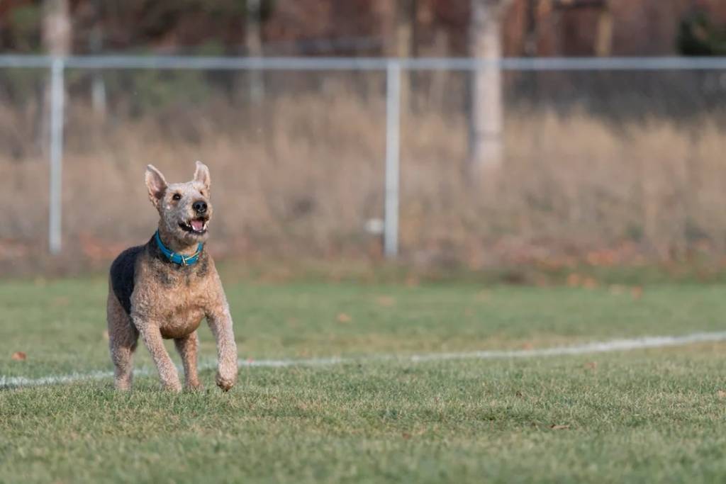 Un Airedoodle courant sur un terrain herbeux et portant un collier autour du cou