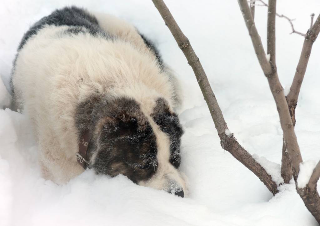 Des chiots Akbash jouent dans la neige