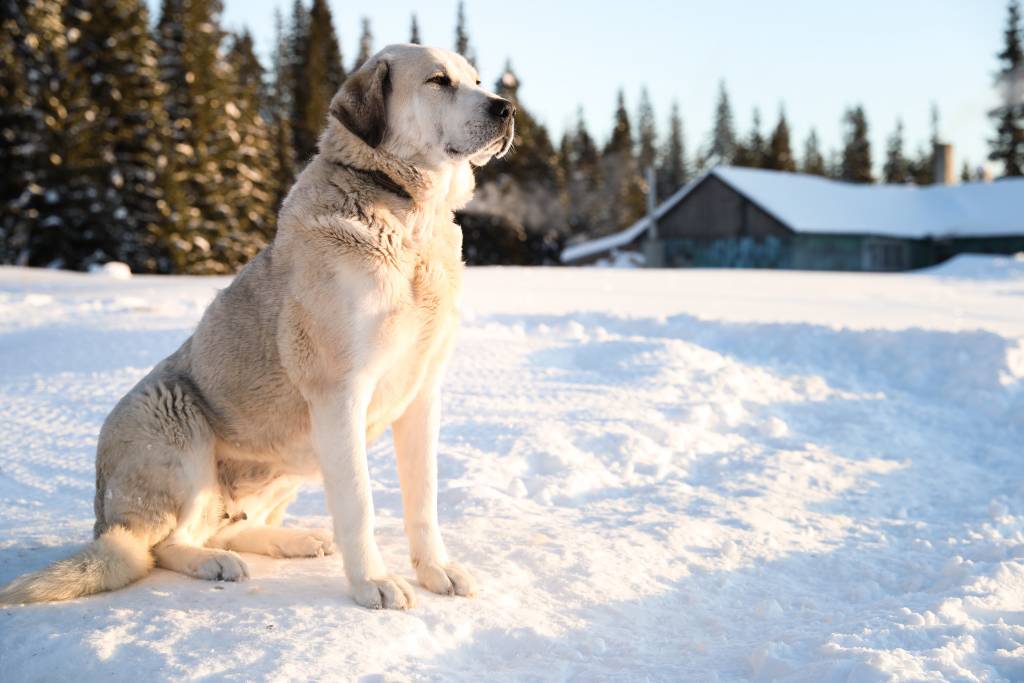 Un Akbash assis dans la neige en montagne