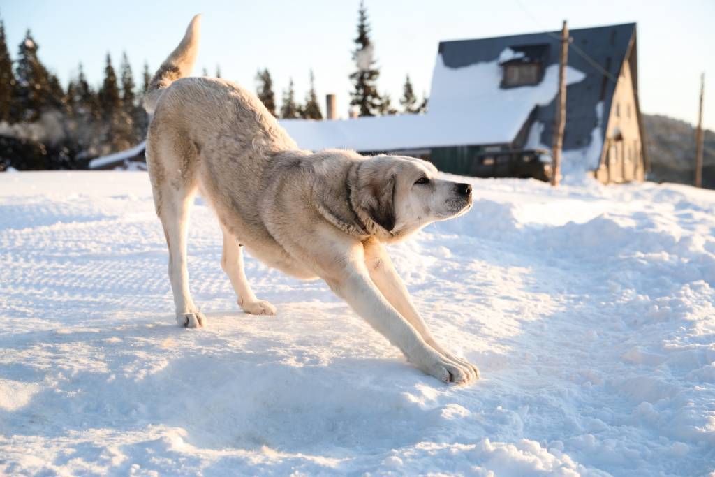 Des chiots Akbash jouent dans la neige