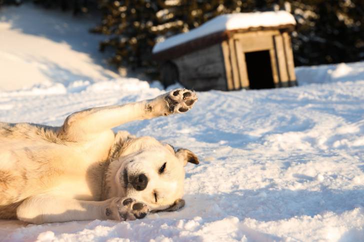 Des chiots Akbash jouent dans la neige