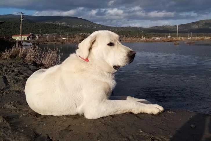 Un Akbash allongé sur une berge et portant un collier autour du cou