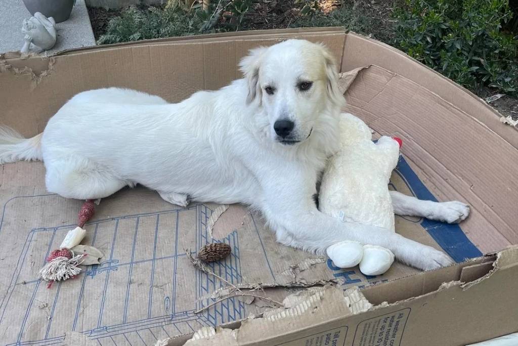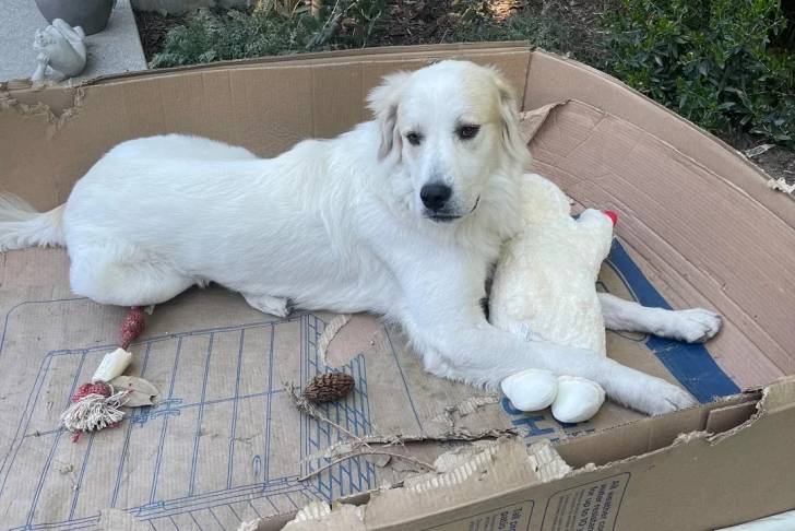Un Akbash allongé dans un carton et regardant vers la caméra