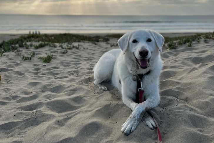 Un Akbash allongé sur une surface sableuse et ayant la gueule légèrement ouverte