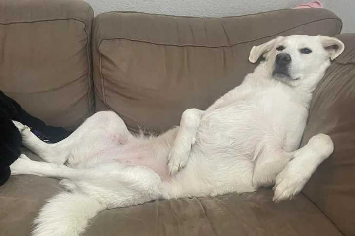 Un Akbash allongé sur un canapé et regardant vers la caméra