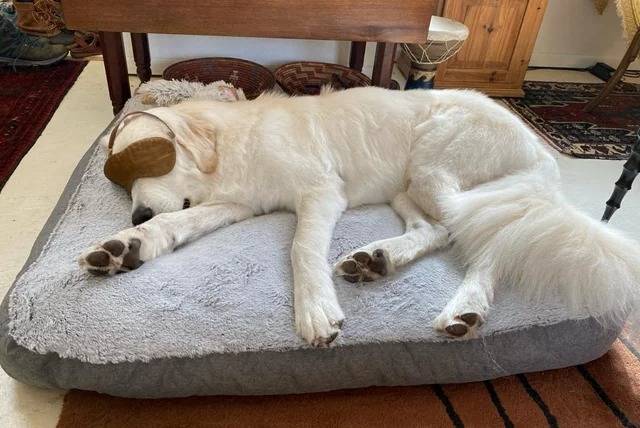 Un Akbash allongé sur un panier et portant un masque sur les yeux