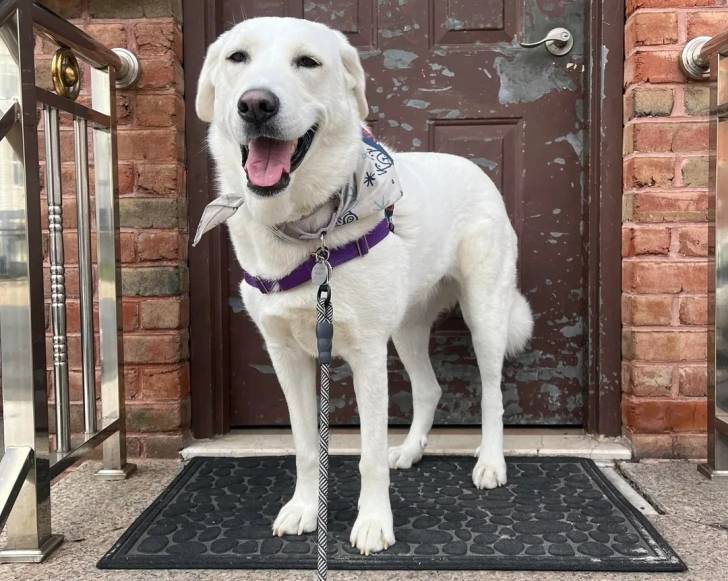 Un Akbash devant une porte et qui est tenu en laisse