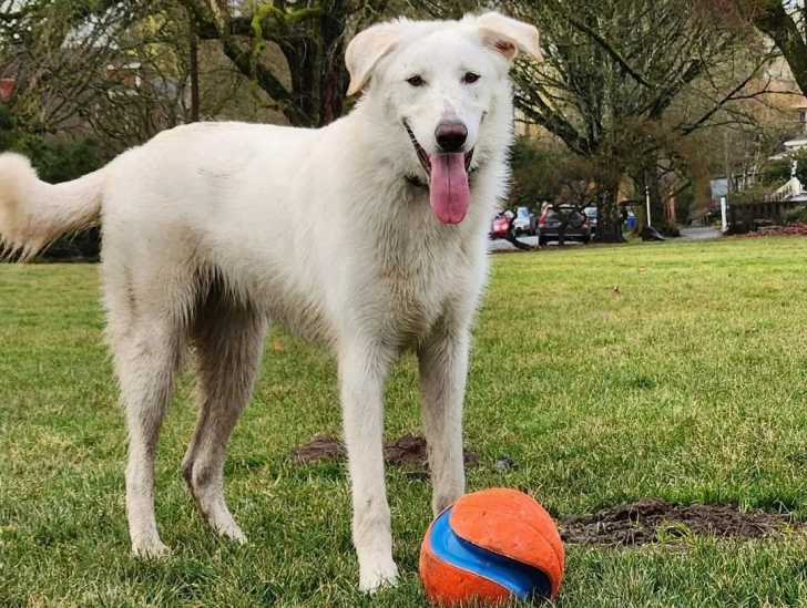 Un Akbash sur une surface gazonnée et ayant la langue pendante