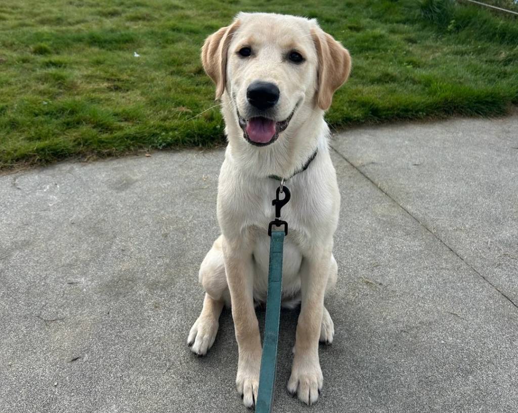 Un Akbash assis sur une surface bétonnée et tenu en laisse