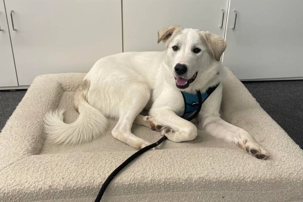 Un Akbash allongé sur un panier