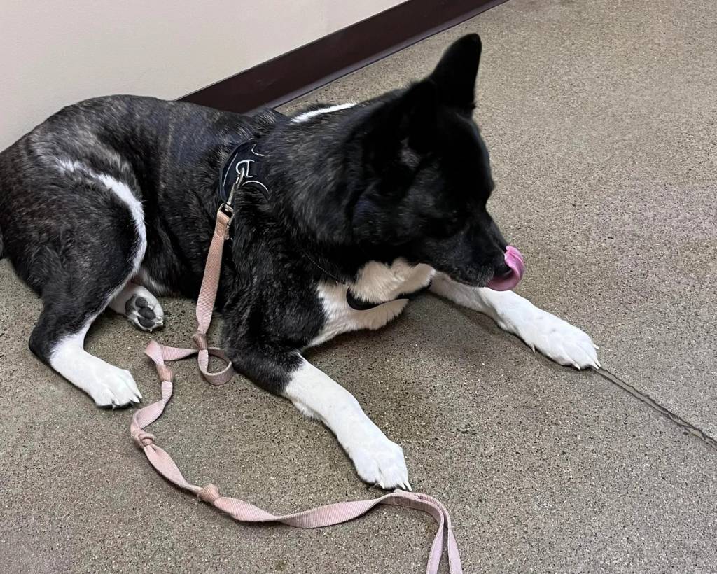 Un Akita Chow allongé sur une moquette et qui est tenu en laisse