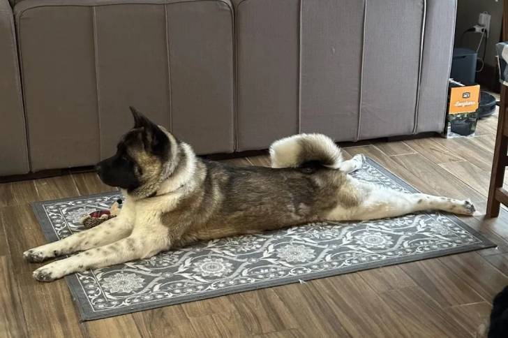 Un Akita Chow allongé sur un tapis et semblant détendu
