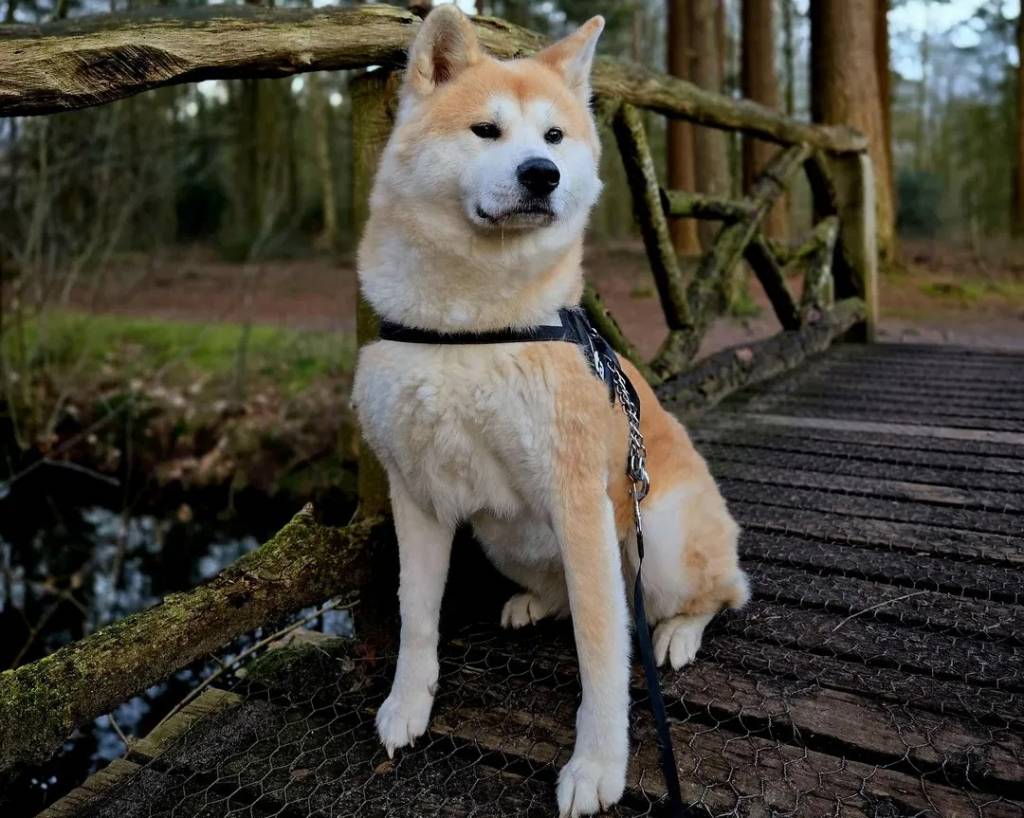 Un Akita Chow assis sur un pont en bois et qui est tenu en laisse