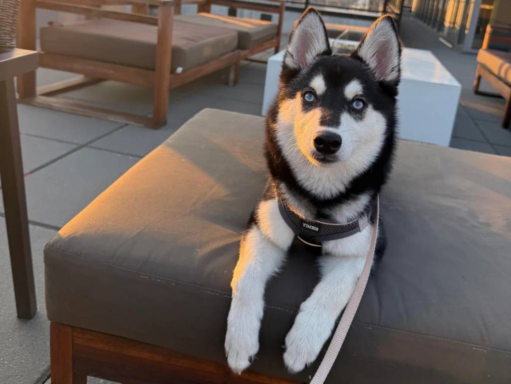 Un Alaskan Klee Kai allongé sur un fauteuil et qui est tenu en laisse