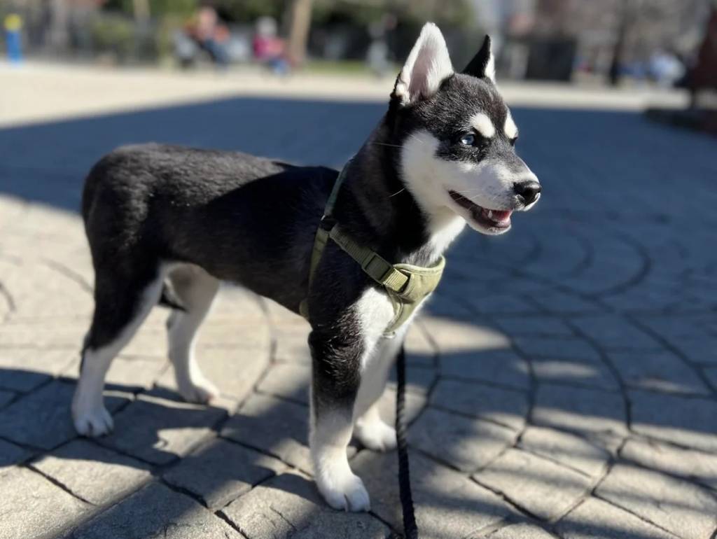 Un Alaskan Klee Kai sur un sol pavé et qui est tenu en laisse