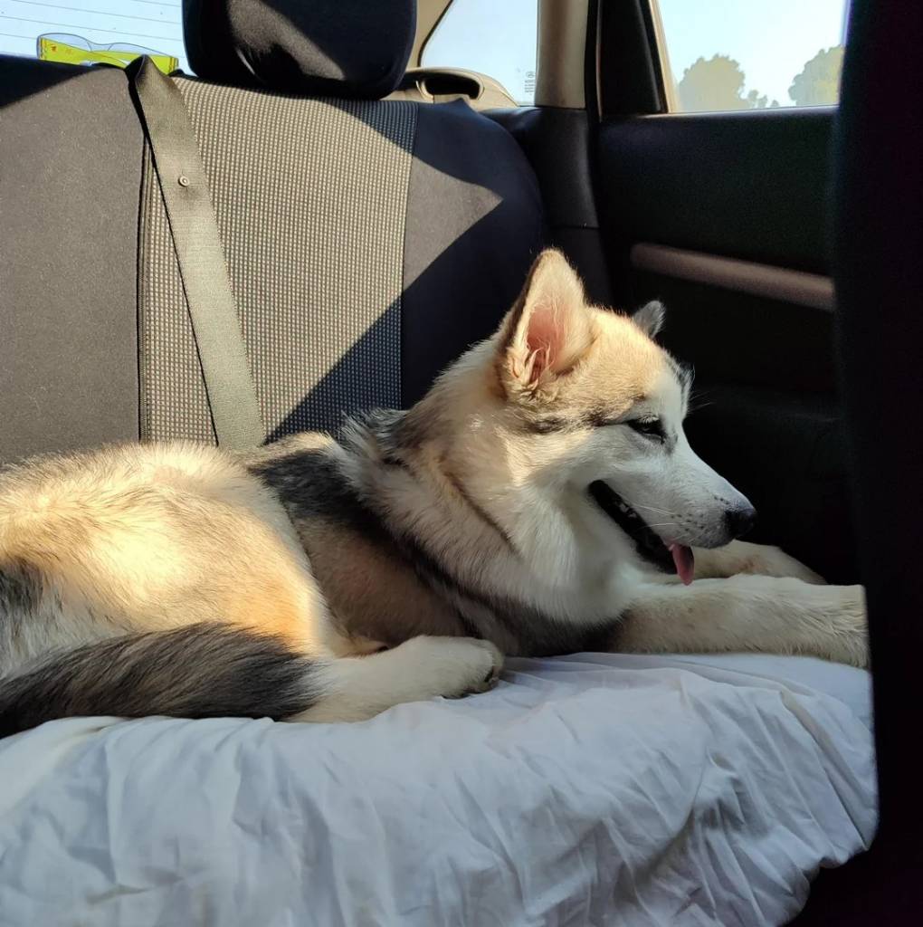 Un Alusky allongé sur la banquette arrière d'une voiture et semblant détendu