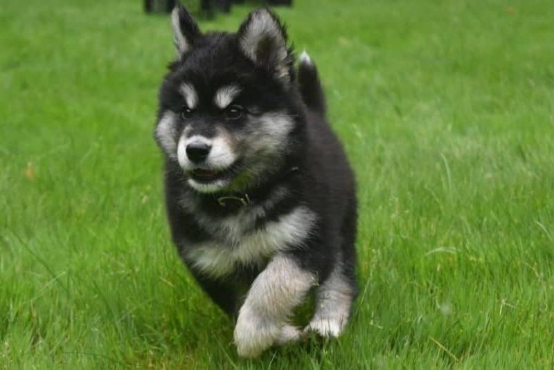 Un Alusky marchant sur un terrain herbeux et portant un collier autour du cou