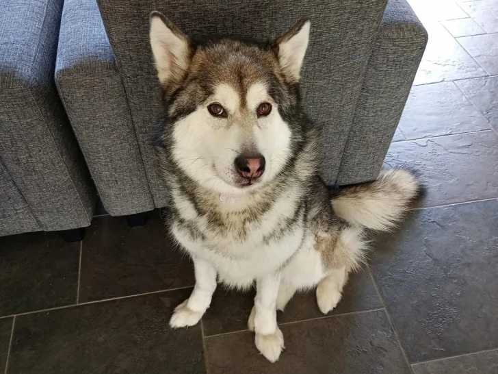 Un Alusky assis sur un sol carrelé et regardant vers la caméra