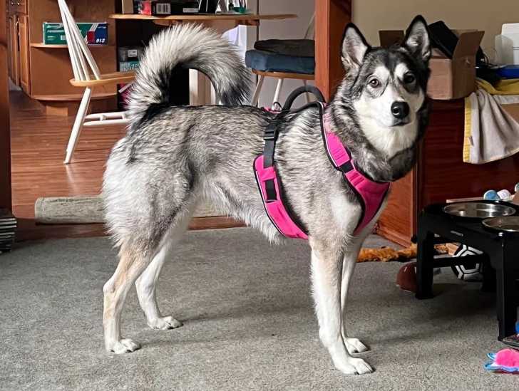 Un Alusky sur une moquette et portant un harnais