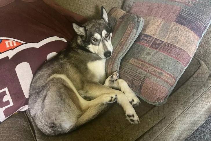Un Alusky allongé sur un canapé et regardant vers la caméra