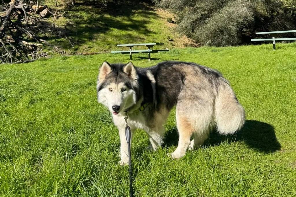 Un Alusky sur une surface gazonnée et qui est tenu en laisse