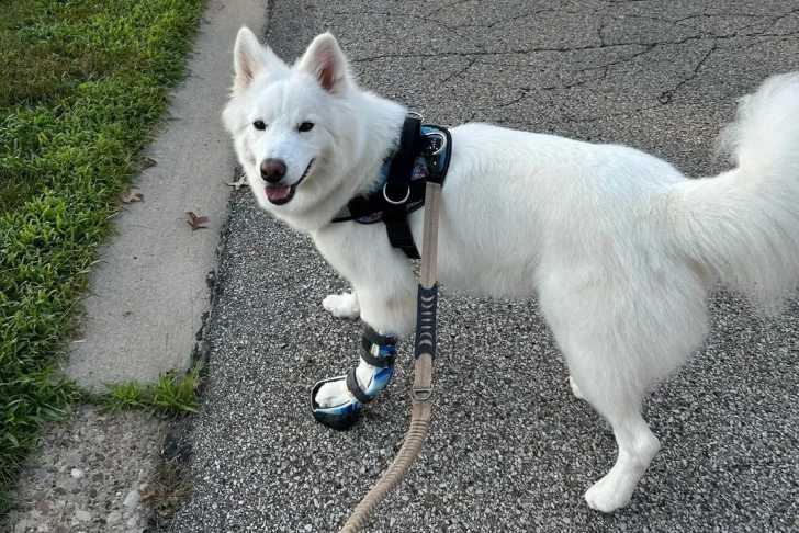 Un Alusky sur une surface bitumée et qui est tenu en laisse