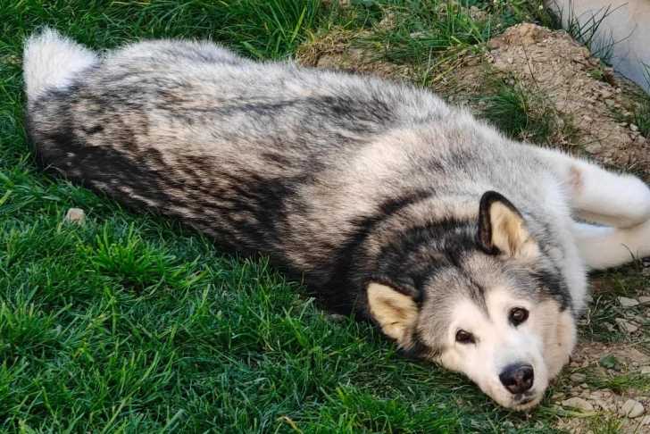 Un Alusky allongé sur un terrain herbeux et regardant vers la caméra