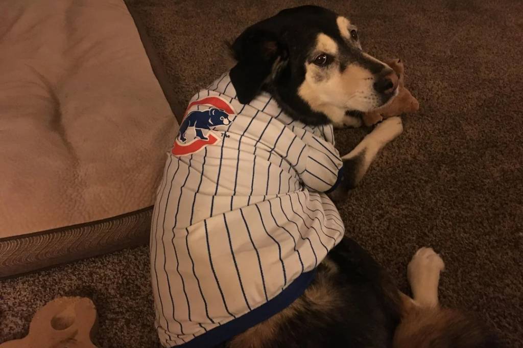 Un Alusky allongé sur une moquette et portant un habit pour chien