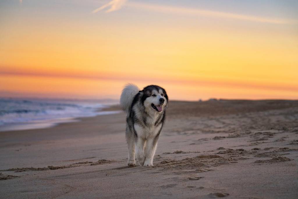Un Alusky marchant sur une surface sableuse et ayant la gueule ouverte