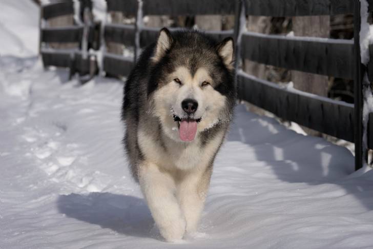 Un Alusky marchant sur une surface enneigée et tirant la langue