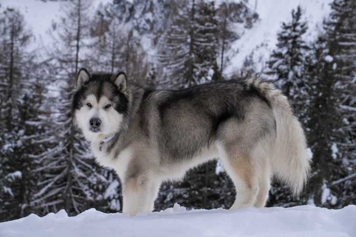 Un Alusky sur une surface enneigée portant un collier autour du cou
