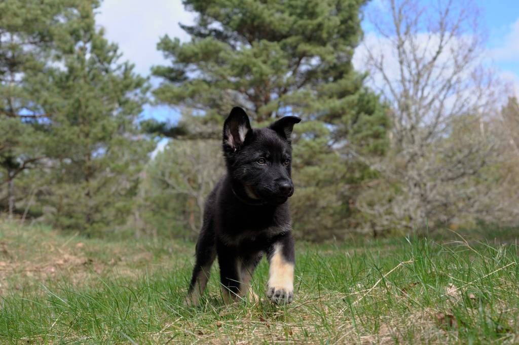 Un chiot American Alsatian à robe noire sur un champ d’herbe avec des arbres
