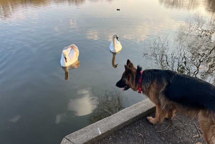 Un American Alsatian à robe noire et fauve regardant un lac avec des cygnes