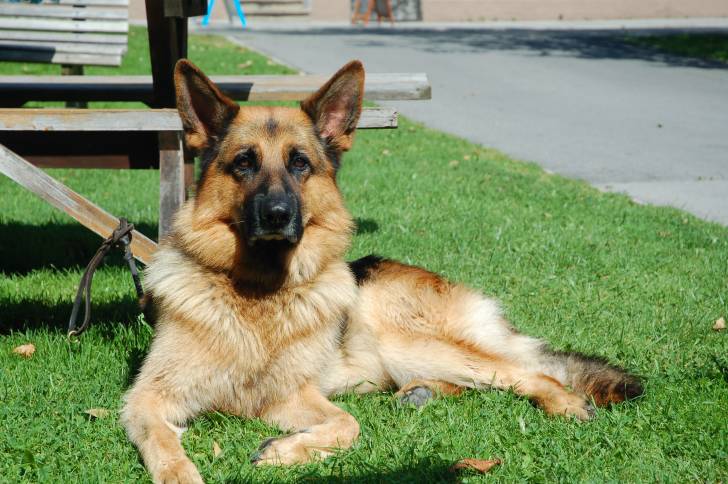 Un American Alsatian à robe fauve allongé dans l’herbe d'un parc