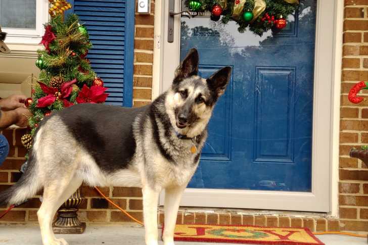 Un American Australian à robe noire portant un collier bleu devant une porte en bois bleue