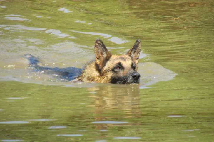Un American Alsatian nageant dans une eau verte sous le soleil