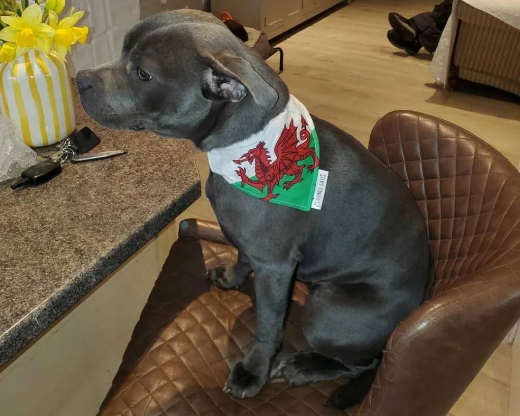 Un American Bully Staffy Bull Terrier assis sur une chaise et portant un foulard