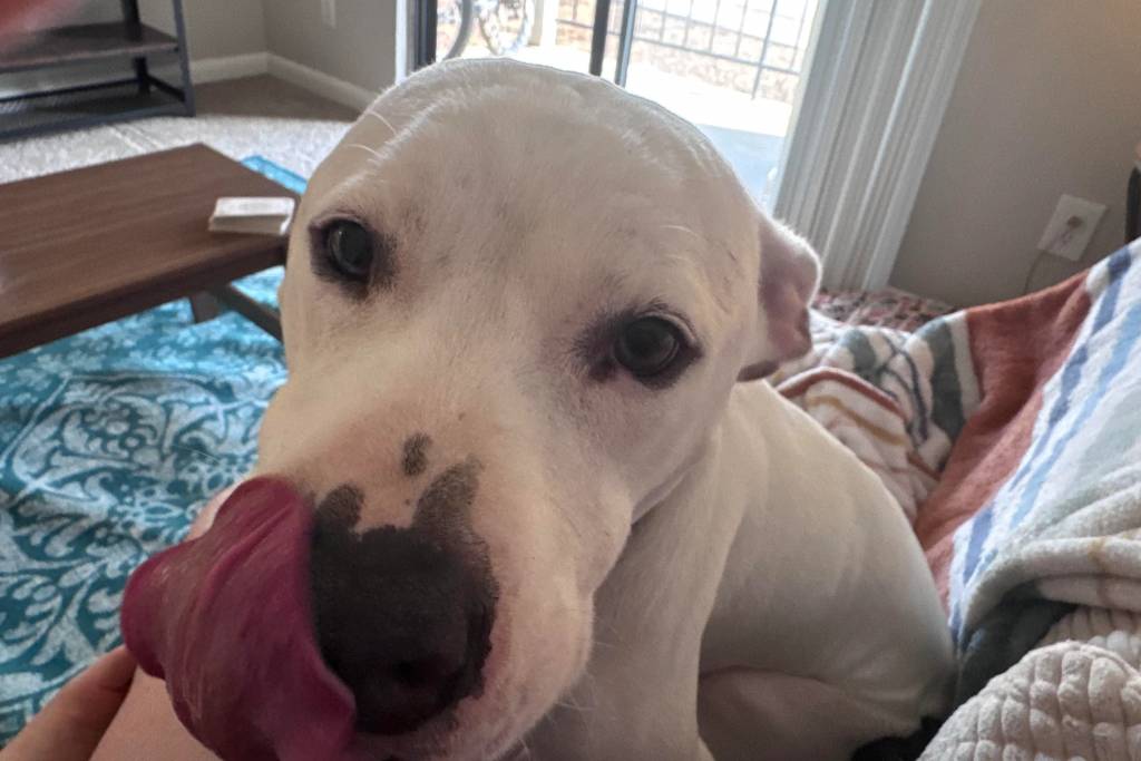 Un American Bully Staffy Bull Terrier se léchant les babines