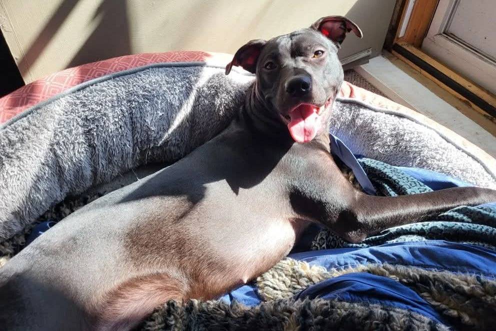 Un American Bully Staffy Bull Terrier allongé dans un panier
