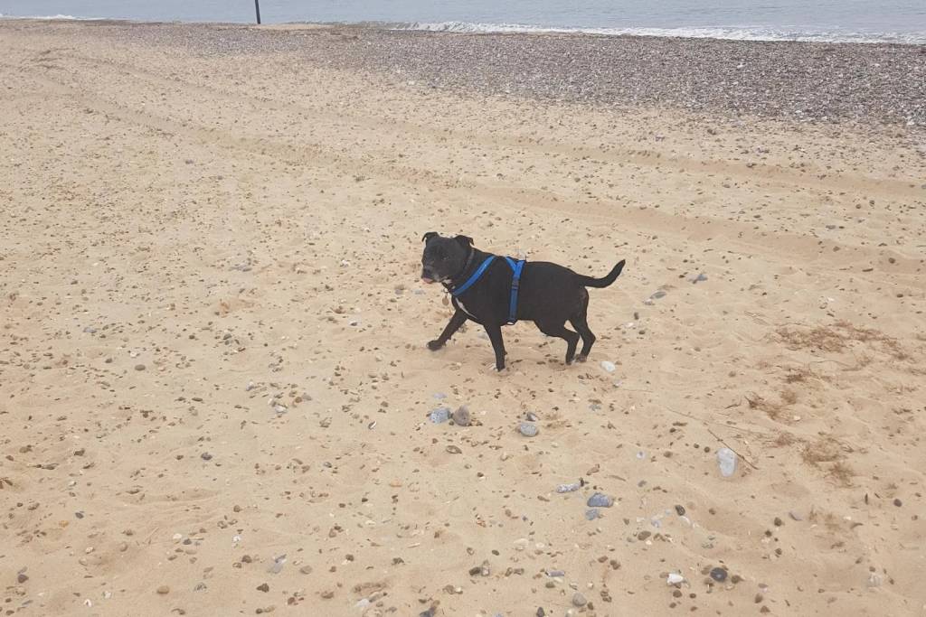 Un American Bully Staffy Bull Terrier marchant sur une surface sableuse et portant un harnais