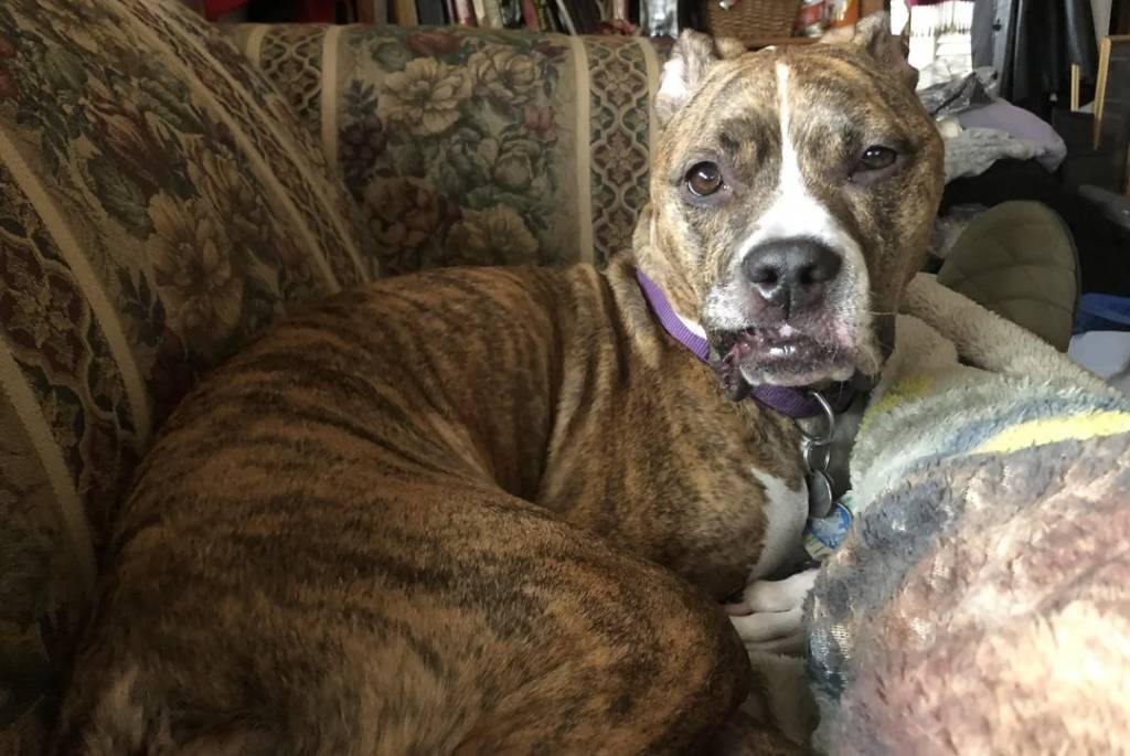 Un American Bully Staffy Bull Terrier allongé sur un canapé et portant un collier au cou