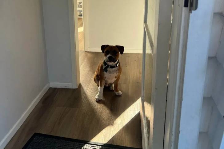 Un American Bully Staffy Bull Terrier assis sur un parquet